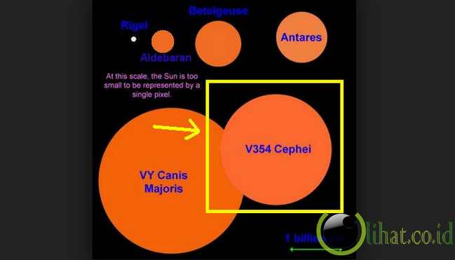 [lihat.co.id] - Bagian dari konstelasi Canis Major, bintang hiper raksasa ini (satu dengan massa yang besar dan luminositas) adalah bintang terbesar yang telah diketahui, dengan satu radius antara 1,800-2,100 jari-jari solar (kurang lebih 2.7 milyar kilometer), yang berarti setara dengan 900-1,050 matahari dalam satu garis lurus dari pusat ke kelilingnya! Bintang ini diperkirakan 4,900 tahun cahaya dari Bumi.