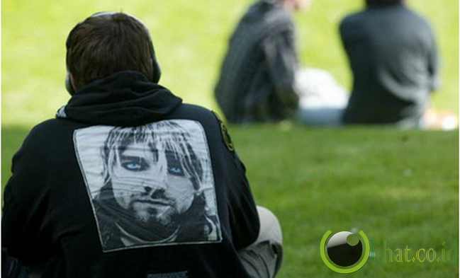 [lihat.co.id] - Seorang penggemar duduk di rumput, mengenakan hoodie dengan gambar wajah Kurt di bagian punggungnya,sementara headphone terpasang di telinga. Apakah lagu Nirvana yang didengarkannya?