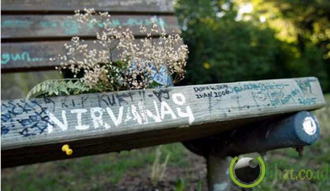 [lihat.co.id] - Ini adalah bangku pinggir jalan yang terletak tepat di sebelah rumah Kurt. Penggemar menorehkan nama dan tulisan sebagai kenang-kenangan di sana, juga meninggalkan bunga sebagai tanda mereka mengingat sang idola.