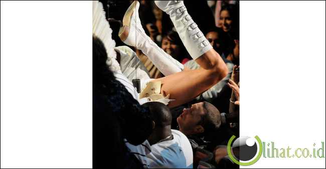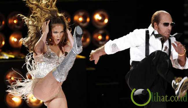 Tarian tersebut makin membuat para penonton menjerit saat partnernya muncul di atas panggung. Partnernya tersebut tak lain adalah Jennifer Lopez yang mengenakan leotard berkilauan. Keduanya pun berduet dan menari dengan nakalnya.