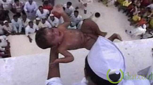 [lihat.co.id] - Setiap tahun di bulan Desember, lebih dari seratus bayi dilempar dari atap candi menjadi kerumunan di bawah ini. Mereka merosot 200 kaki, di mana sekelompok orang berdiri menunggu dengan kain dimaksudkan untuk menangkap mereka. Alasannya? Pasangan menikah - ingin diberkati dengan, mungkin ironisnya, lebih banyak bayi - ambil bagian dalam acara ini.