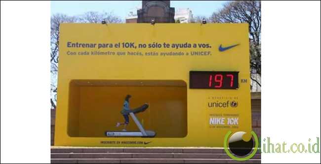 [lihat.co.id] - Perusahaan yang bergerak di bidang peralatan dan aksesoris olahraga ini selalu mempunyai iklan yang unik di setiap produknya. Salah satunya adalah papan reklame berikut, mereka menempatkan sebuah treadmill di dalam sebuah papan reklame untuk memperkenalkan treadmill buatan mereka. Semua orang bisa memakai treadmill yang terletak di dalam papan reklame unik ini.