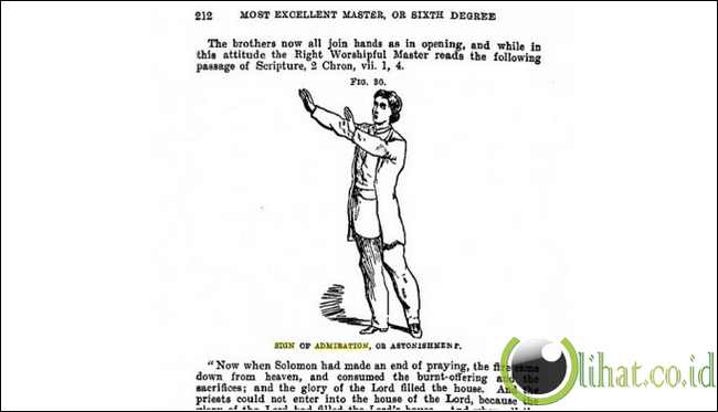 �Menurut buku masonic,gerakan tangan yang dilakukan oleh pengunggang kuda putih telanjang disebut �Sign of Admiration.� Tanda ini ada pada kuil untuk ritual raja Salomon,tetapi pada kenyataannya itu penyembahan untuk sinagog setan. Pengormatan ini untuk pemimpin dan raja mereka , Lucifer, atau dikenal sebagai �Pangeran penguasa udara.�