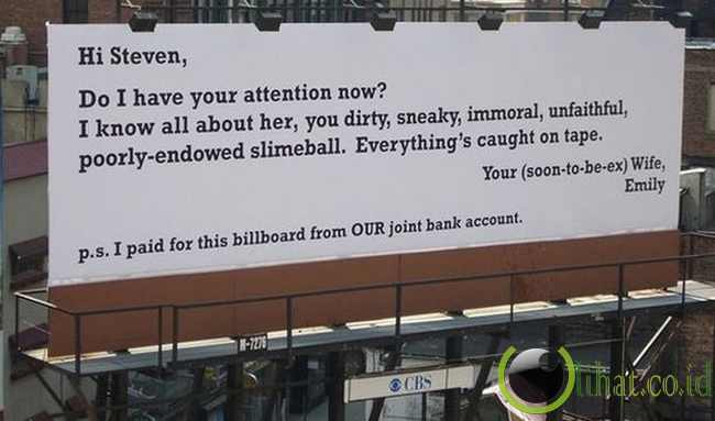 Merasa diselingkuhi, Emely memasang iklan berukuran sangat besar dan menumpahkan kekesalannya di sana pada sang suami, Steven. Tak terbayang betapa malunya Steven, perilaku buruknya diketahui seisi kota.