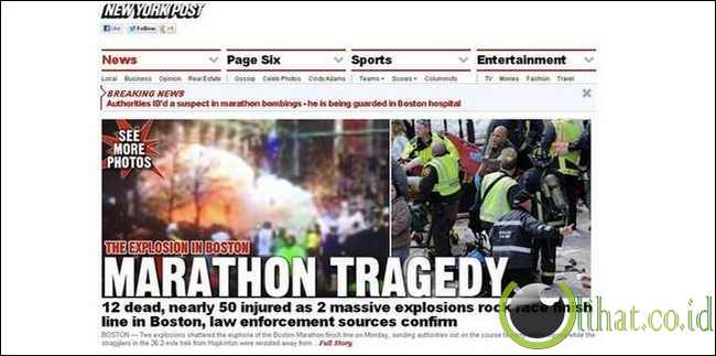 [lihat.co.id] - Kabar ini disampaikan oleh New York Post. Dalam website tabloid yang terbit sekitar pukul 18.58 waktu setempat, mereka masih mencantumkan kabar 12 orang meninggal dunia Namun kini sudah diperbarui Polisi Boston baru memberikan konfirmasi sejauh ini ada tiga orang tewas. Sementara korban luka terdiri dari 176 orang, 17 di antaranya dalam kondisi kritis.