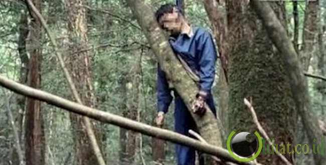[lihat.co.id] - Mayat pria tergantung kaku di sebuah pohon di hutan Aokigahara.